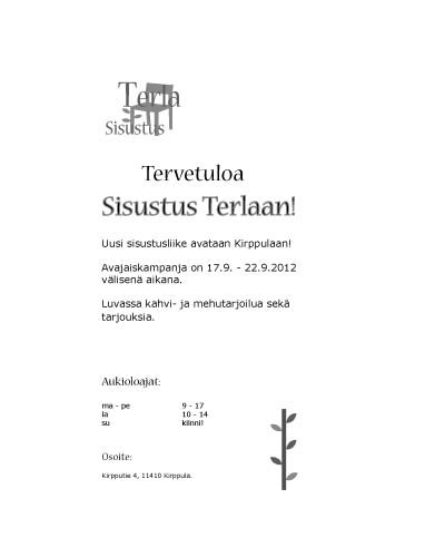 Sisustus Terlan avajaiskampanja järjestetään 17.9. - 22.9.2012 välisenä aikana. Kampanjan aikaan myymälässä on tarjouksia sekä kahvi- ja mehutarjoilua. Kohderyhmä kampanjalle on sisustamisesta kiinnostuneet ihmiset ja perheet.