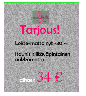 Kun ostaa korkeamman Sofia-vitriinin saa -50 % alennuksen yhdestä vapaavalintaisesta matosta ja, jos ostaa matalamman vitriinin saa -30 % alennuksen yhdestä vapaavalintaisesta matosta.